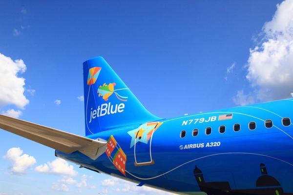 The Airbus 320 aircraft, tail N779JB, is named “Bluericua,” blending JetBlue’s brand with the affectionate name for people of Puerto Rican descent.